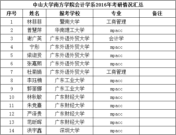 在2016年研究生招生考试中,我院会计学系学生取得佳绩,有29名同学的分数达到国家线,其中林菲菲等14名同学被暨南大学、广东外语外贸大学、广东工业大学、深圳大学等国内知名高校拟录取,将进入更高层次的学习。 拟录取名单见附表:...