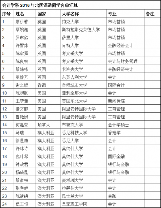 继14名同学考取国内研究生之后,会计系又有24名同学获得出国留学机会的捷报。至此,本系考取国内外研究生人数为38人。本系历来注重学生的差异化培养,尤其重视鼓励学生考研,已经初步形成包括开展考研动员、召开考研座谈会、...