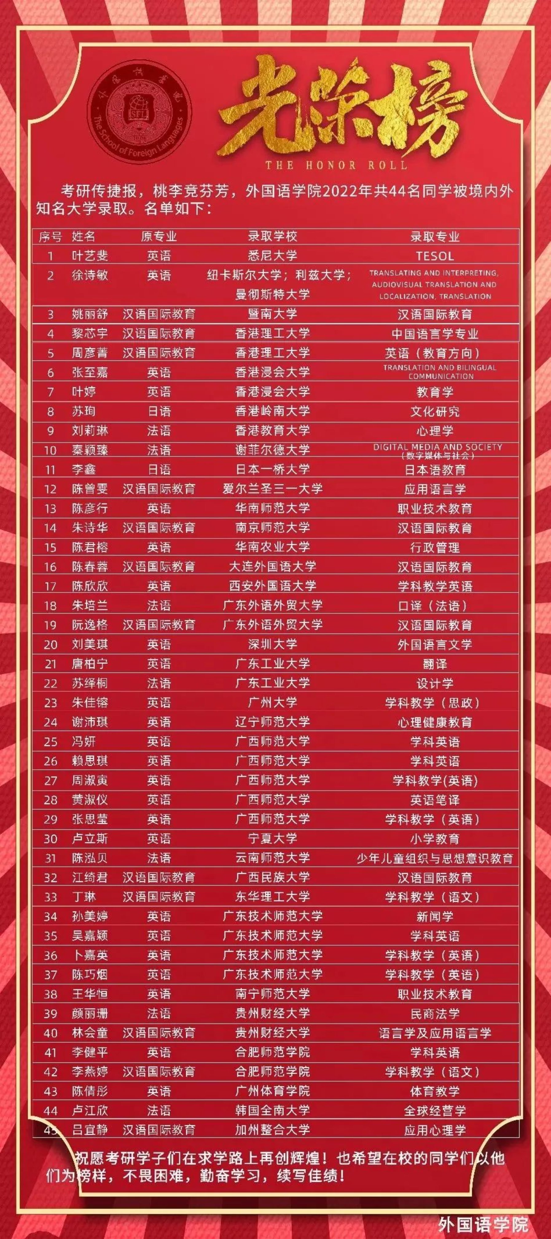 硕果累累香满径,捷报频频传佳音。2022年yabo鸭脖官网再传佳绩,截至目前,共有199位优秀学子考取硕士研究生,其中境内升学123人,境外升学76人。被录取的123名境内考研同学中,有被中山大学、暨南大学、中国地质大学、...