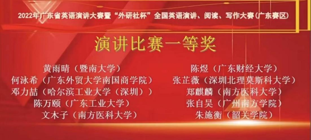 近日,2022年 “外研社杯”全国英语演讲大赛(广东赛区)决赛落下帷幕。yabo鸭脖2020级英才班学生张自昊、2019级英语专业学生许舒琪与来自包括中山大学、华南理工大学、暨南大学和广东外语外贸大学等在内的全省67所高校的149位选手同台竞技,...