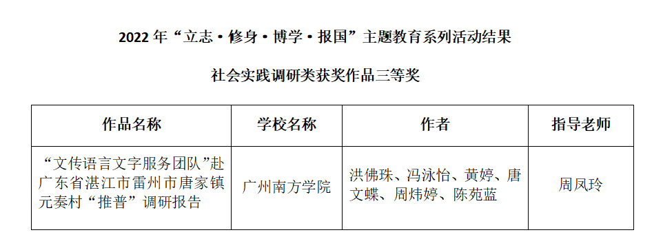 近日,广东省教育厅2022年“立志•修身•博学•报国”主题教育系列活动获奖名单揭晓,由校团委推送的《“文传语言文字服务团队”赴广东省湛江市雷州市唐家镇元奏村“推普”调研报告》项目荣获社会实践调研类作品三等奖。...