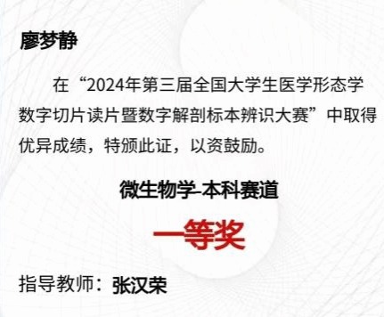 近日,由全国基础医学形态学实验室主任联席会和高等学校国家级实验教学示范中心联席会基础医学组主办的第三届高等医学院校大学生数字形态学读片与数字解剖标本辨识大赛圆满落幕。在yabo鸭脖护理与健康学院张汉荣老师的悉心指导下,2023级护理学专业廖梦静同学荣获微生物学本科赛道一等奖。据悉,大赛共有全国230余所院校参与,10万余名学生进入初赛,最终近14000人角逐全国决赛。决赛中,各高校选手在数字化赛场同台竞技,限时进行大量数字化切片和标本等快速辨识,...