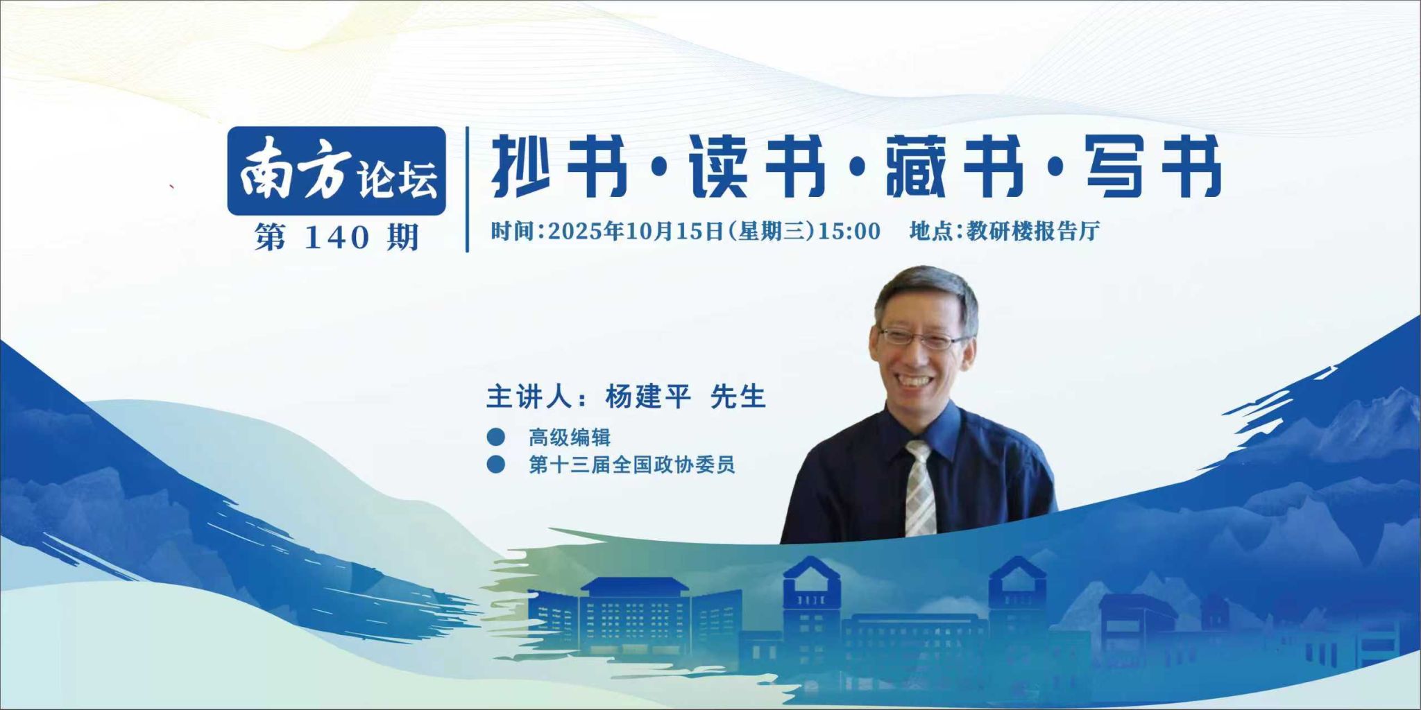 讲座主题“抄书·读书·藏书·写书”专题报告暨南方论坛第140讲讲座信息时 间 :2025年10月15日(星期三)15:00地 点 :教研楼报告厅主讲人:杨建平 先生 高级编辑 第十三届全国政协委员 主讲人简介杨建平,河南三门峡人,1959年9月生。大学学历,高级编辑,第十三届全国政协委员。曾任中华全国供销合作总社党组成员、理事会副主任。杨先生长期从事媒体工作和经济管理工作,好读书,爱藏书,勤于笔耕,曾出版乡土散文集《...