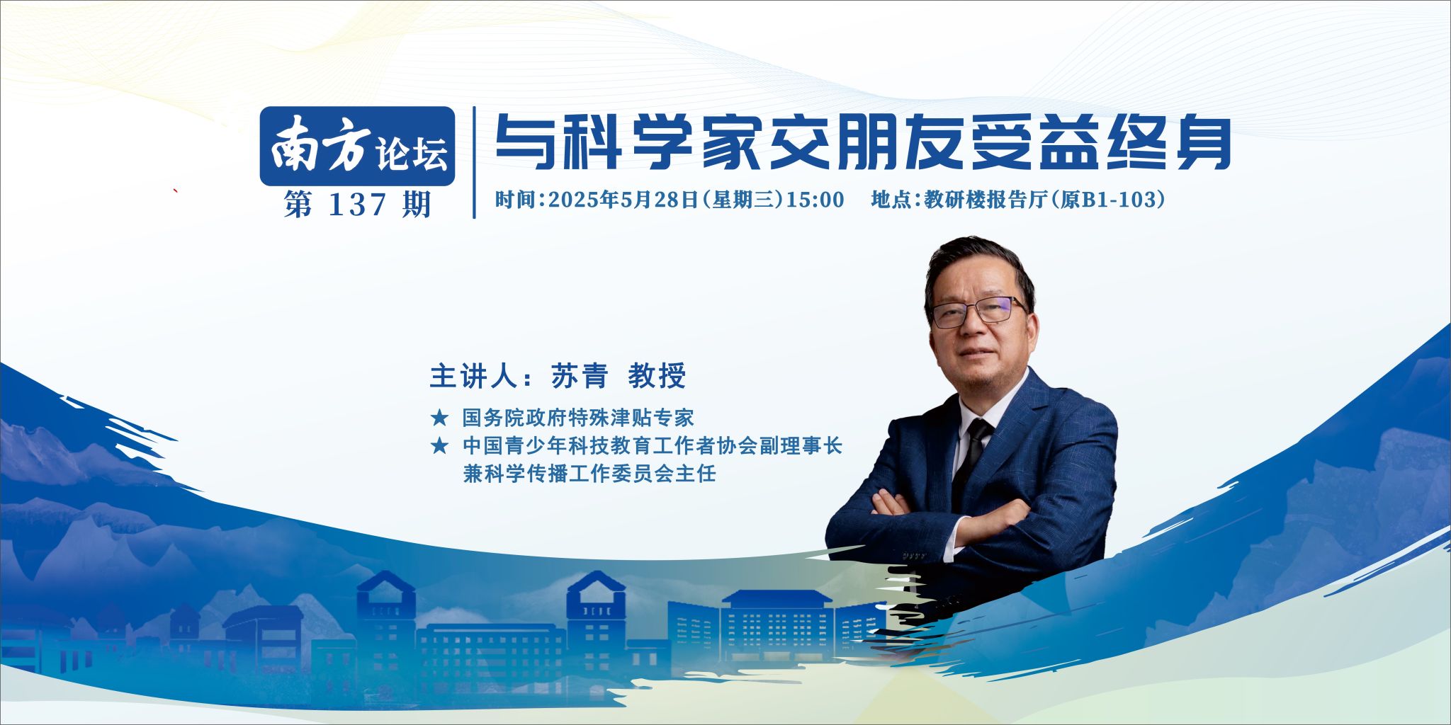 讲座主题“与科学家交朋友受益终身”专题报告暨南方论坛第137讲讲座信息时 间 :2025年5月28日(星期三)15:00地 点 :教研楼报告厅(原B1-103)主讲人:苏青教授,国务院政府特殊津贴专家,中国青少年科技教育工作者协会副理事长兼科学传播工作委员会主任主讲人简介 苏青,男,研究员,博士,国务院政府特殊津贴专家,全国新闻出版行业领军人才,现任中国青少年科技教育工作者协会副理事长兼科学传播工作委员会主任;中国科普作家协会荣誉理事,...