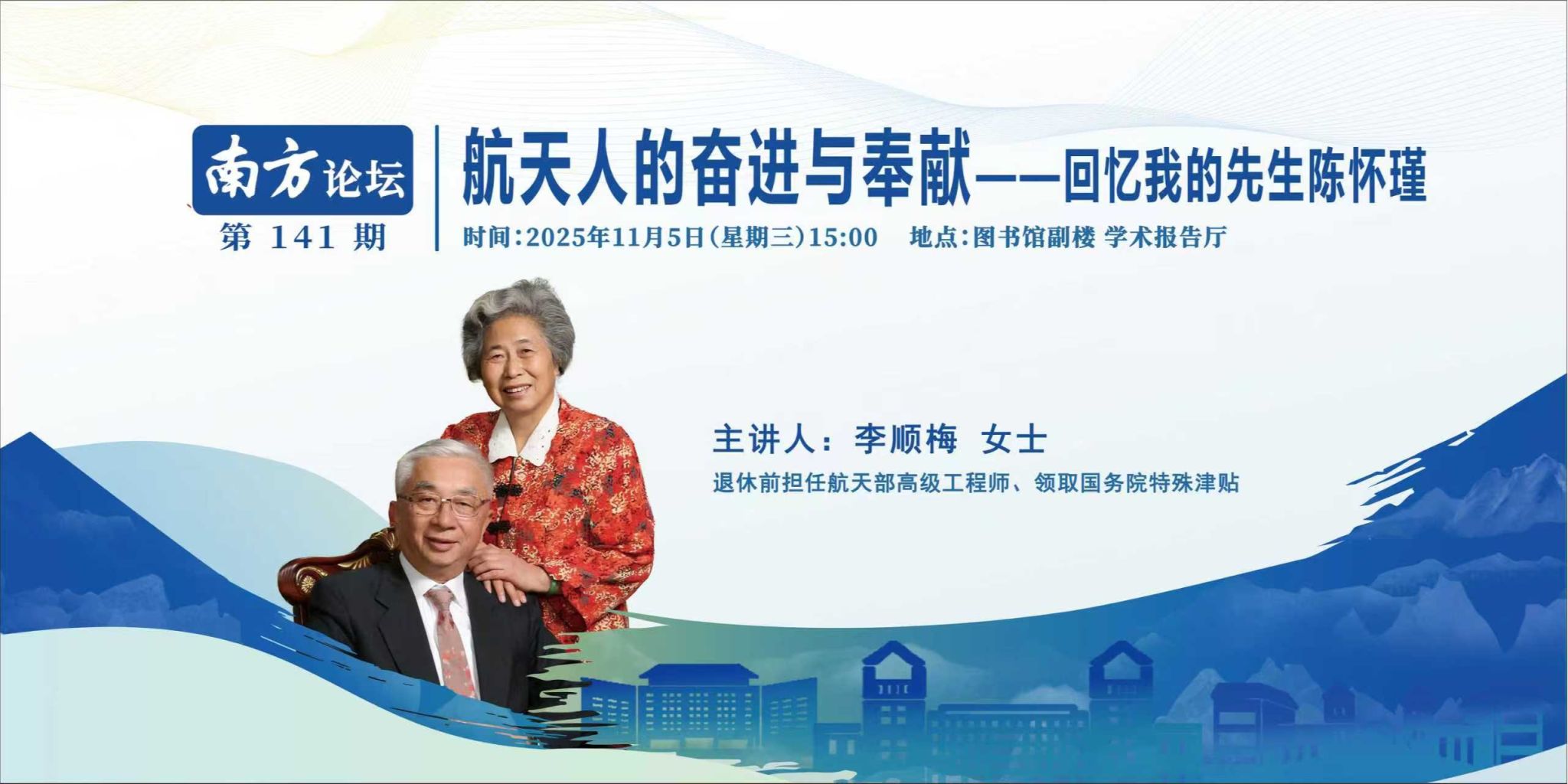 讲座主题“航天人的奋进与奉献——回忆我的先生陈怀瑾”专题报告暨南方论坛第141讲讲座信息时 间:2025年11月5日(星期三)15:00地 点:图书馆副楼 学术报告厅主讲人:李顺梅 女士 退休前担任航天部高级工程师、领取国务院特殊津贴 主讲人简介 李顺梅,江苏宜兴人。1933年出生在宜兴和桥镇附近的小园里,1946年毕业于和桥中学后,考入苏州高级中学,1951毕业后考入交通大学自动控制系。毕业后,经过国家选拔,在留苏预备部学习俄文。...