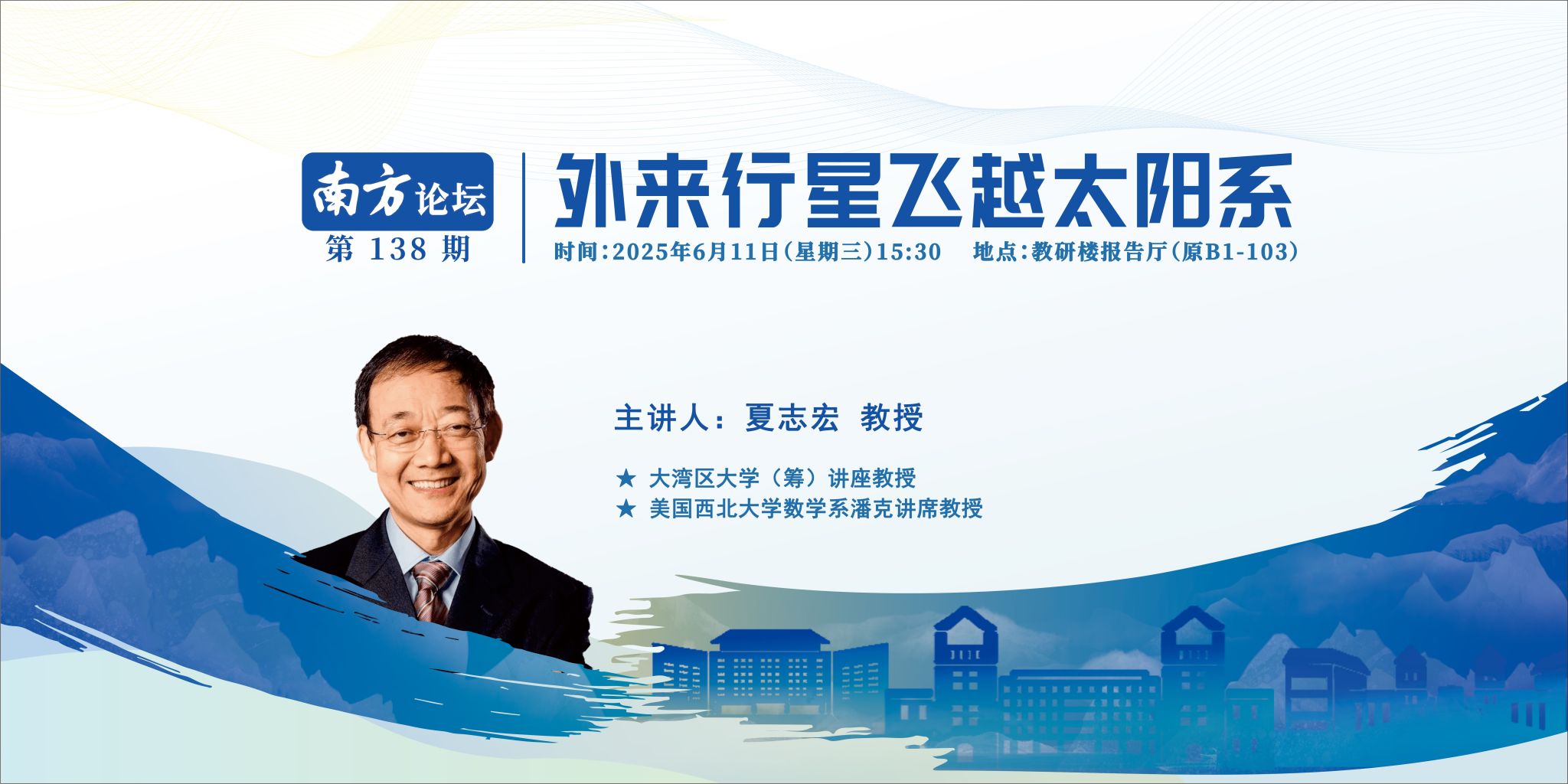 讲座主题“外来行星飞越太阳系”专题报告暨南方论坛第138讲讲座信息时 间 :2025年6月11日(星期三)15:30地 点 :教研楼报告厅(原B1-103)主讲人:夏志宏教授,大湾区大学(筹)讲座教授,美国西北大学数学系潘克讲席教授。主讲人简介夏志宏,大湾区大学(筹)讲座教授,美国西北大学数学系潘克讲席教授。主要研究兴趣为动力系统、太阳系动力学、人工智能算法。主要成就包括解决百年悬而未决的庞勒维猜想,和黎健一起发现几亿年曾有太阳系外大行星在木星与土星之间飞过。...