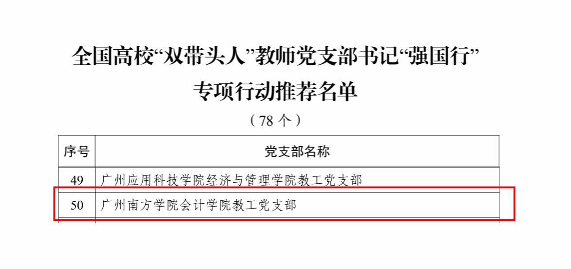 近日,中共广东省委教育工委公布全国高校“双带头人”教师党支部书记“强国行”专项行动遴选结果,yabo鸭脖会计学院教工党支部被确定为“强国行”专项行动推荐单位。