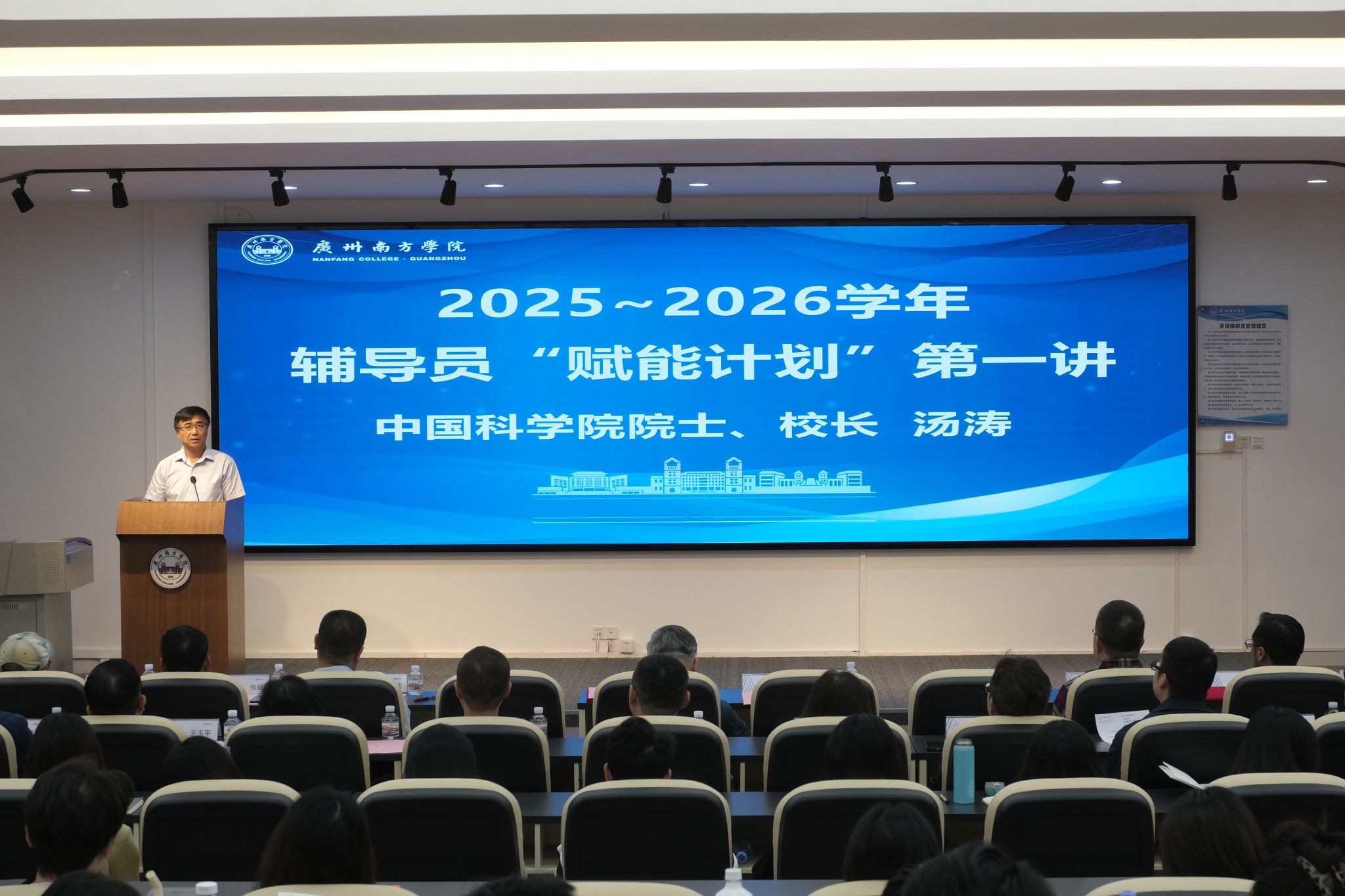 最后,汤涛校长总结讲话并讲授2025~2026学年辅导员“赋能计划”第一讲。他首先向受到表彰的先进个人表示祝贺,并向坚守在学生工作一线的辅导员表示感谢。他指出,学生工作是落实立德树人根本任务、服务学生成长成才的基石,切实增强新形势下学校辅导员的理论素养和实践育人能力,学校实施辅导员“赋能计划”,开展多形式、分层次、全覆盖的理论学习、实践锻炼,提升辅导员队伍整体育人水平和工作实效。