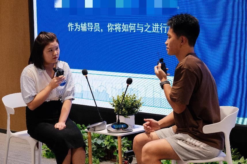 谈心谈话环节,辅导员需根据题目以情景再现的方式开展谈心谈话。在此环节中,10名辅导员与学生助演依次进入赛场。辅导员们的沉浸式演绎让人仿佛身临其境;学生助演根据背景资料,自行扩展内容,提出不同“刁钻”问题,极大考验了辅导员在谈心谈话工作中的沟通技巧和应变能力。