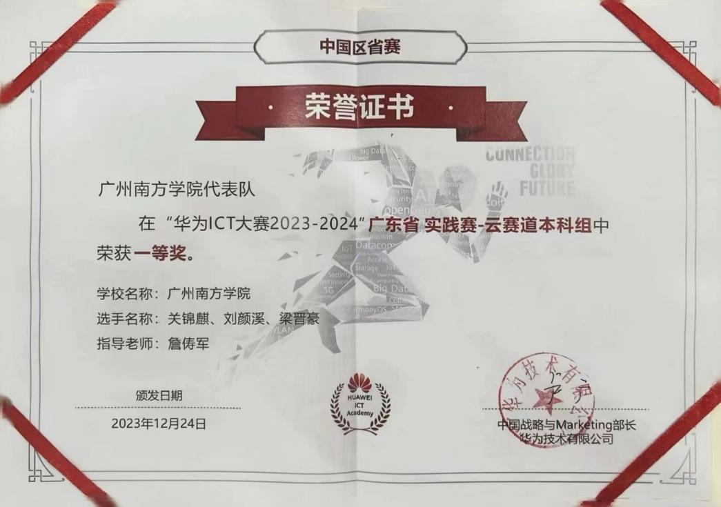 近日,由华为技术有限公司主办,广东省计算机学会、广东省产教融合促进会、广州市产教融合行业协会指导的华为ICT大赛2023-2024中国区广东省实践赛决赛圆满落下帷幕。yabo鸭脖电气与计算机工程学院教师詹俦军、张鉴新、杨斌带领9名同学组成3支队伍,在比赛中分别获得云赛道本科组一等奖,网络赛道本科组二等奖和计算赛道本科组三等奖的好成绩。其中,由yabo鸭脖电气与计算机工程学院教授詹俦军指导,学生关锦麟、刘颜溪、梁晋豪共同组成的队伍获得了云赛道本科组一等奖的佳绩,创下yabo鸭脖在华为ICT大赛中的最佳成绩。