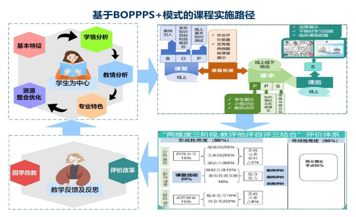 本项目基于BOPPPS教学模式下对生理学翻转课堂进行构建研究及实施。BOPPPS模式注重教学流程的完整性和学生的主动学习,以参与式学习活动为核心,围绕教学目标开展全过程的教学设计。在此基础上,教学团队增加课程衔接(Transition)和评价前置(Pre-evaluation),构建BOPPPS+教学模式,将课程教学过程分为“三阶段一衔接”的闭环学习模式。并融入多元教学方法,搭建“主课堂+拓展课堂”的立体化教学空间,最终以“两维度三阶段,教评他评自评三结合”的评价方式更全面地体现学生的学习成果,鼓励学生自主学习。