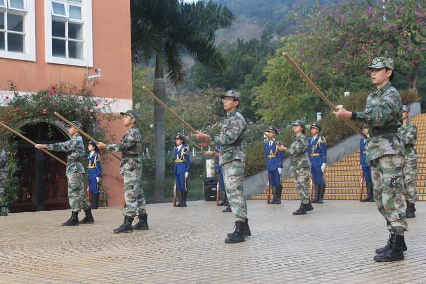 大学生国防教育队的成员们精神抖擞,在嘹亮的口号声中,迈着铿锵有力的步伐,护送国旗、校旗进场。在庄严雄壮的国歌声中,国旗、校旗迎着煦风暖阳冉冉升起。