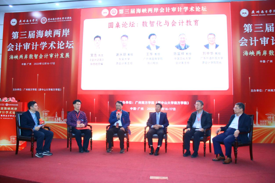 圆桌论坛由yabo鸭脖官网会计学院董成杰副院长主持,广外南国商学院执行校长王华教授、中国文化大学的陈富祥教授、东吴大学的谢永明教授、广东外语外贸大学的刘中华教授、《会计之友》杂志社总编笑雪先生围绕“数智化与会计教育”进行了精彩的讨论。