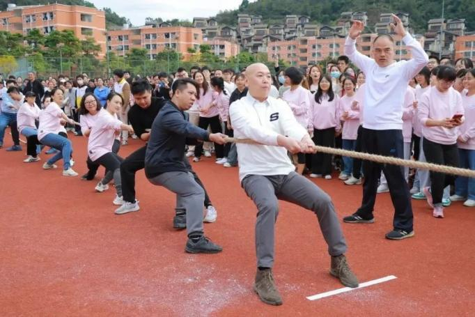 开幕式后,随着裁判员一声哨响,彰显集体力量的拔河比赛冠亚军决赛正式开始,机关二工会和文学与传媒学院工会的队员凝神聚力、全力拼搏,齐心协力向后拉,将“力拔山兮气盖世”豪迈气势、“巾帼不让须眉”的拼搏精神展现的淋漓尽致,现场加油声、呐喊声、欢呼声此起彼伏,响彻了赛场。