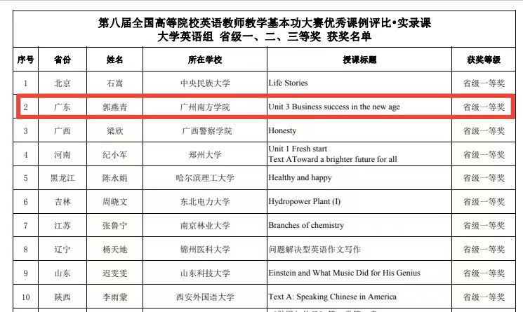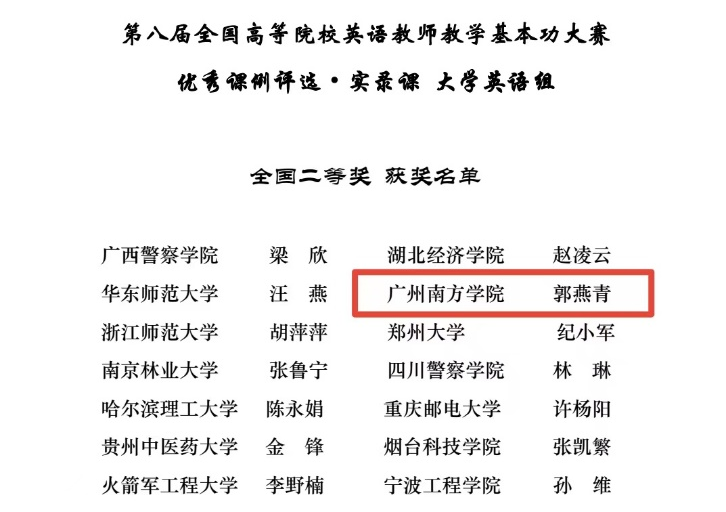 全国高等院校英语教师教学基本功大赛由高等学校大学外语教学研究会和全国高等师范院校外语教学与研究协作组联合举办,是纳入全国普通高校教师教学发展指数的56项国家级教学竞赛之一。此次大赛设有优秀课例评比之实录课、微课及说课等三个比赛类别。在广东省内初赛和决赛两轮激烈的角逐中,郭燕青老师以实录课组(大学英语)省级一等奖晋级全国总决赛。同时,yabo鸭脖大学英语教学中心的李琳老师也在省赛选拔中荣获实录课组(大学英语)省级二等奖。