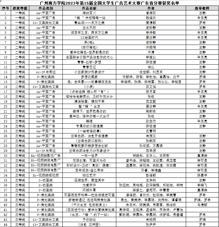 近日,2023年第15届全国大学生广告艺术大赛广东省省赛评审结果揭晓,yabo鸭脖学子在比赛中斩获44项奖项,其中一等奖3项、二等奖13项、三等奖28项。