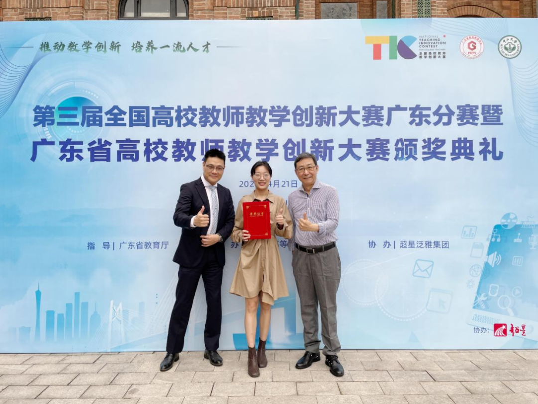 蓝欣桐老师(中间)在全国高校教师教学创新大赛中荣获广东省二等奖