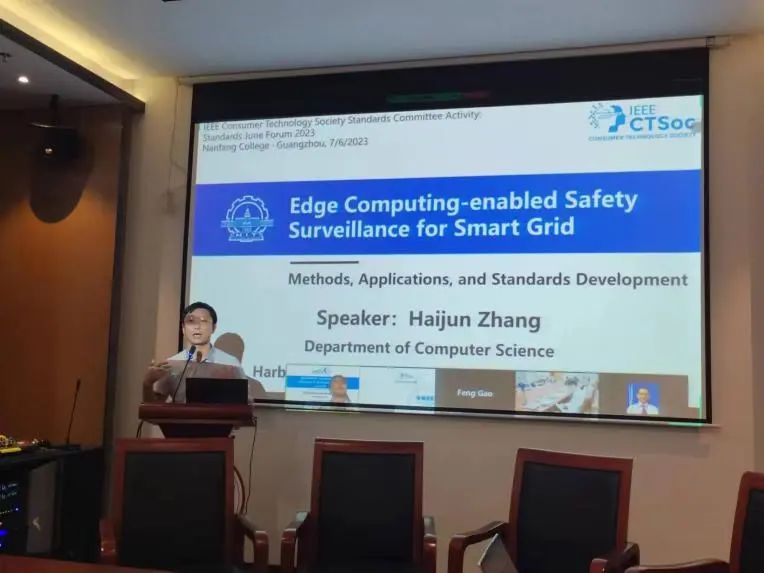 最后是Panel交流讨论,主题为Innovations in standards development,由Kim Fung Tsang主持。加拿大的Raed bdullah博士首先进行在线介绍,然后中国信息通讯研究院池程主任进行Introduction of IEEE Standard Activities的分享,美国UL中国代表处郭记松介绍了Overview of ULSE,英国伦敦布鲁内尔大学的赖俊升博士分享Innovative Standards for Energy Systems in Smart Cities,哈尔滨工业大学张海军教授分享Edge Computing-enabled Safety Surveillance for Smart Grid。