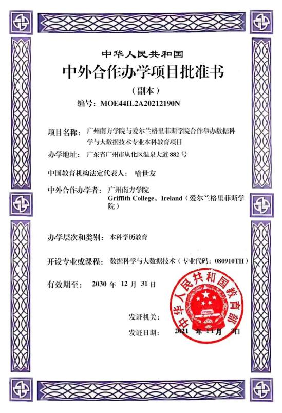 2021年11月,经教育部批准,yabo鸭脖官网与爱尔兰格里菲斯学院合作举办“数据科学与大数据技术”专业本科教育项目。这是yabo鸭脖第一个获得教育部批准的中外合作办学项目,填补了我省大数据专业中外合作办学领域的空白。