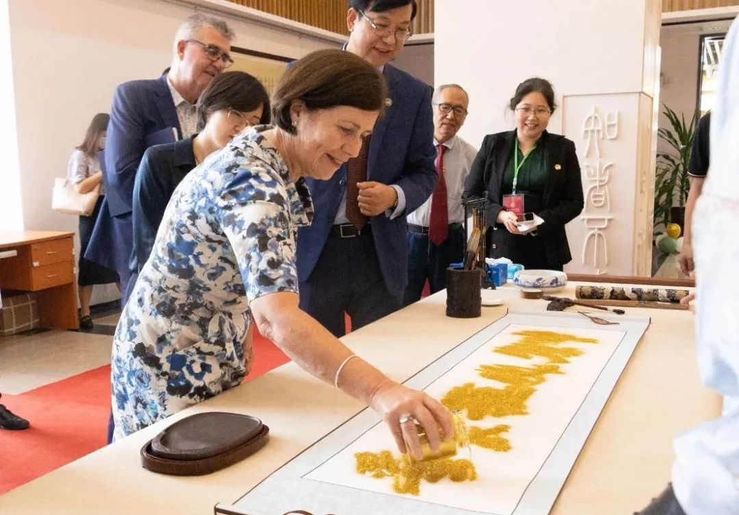 图书馆前,南方学院师生为安黛文大使一行献上国乐合奏《象王行》、长笛吹奏爱尔兰名曲《Down By the Salley Garden》及国风舞《漫步青绿图》等表演并以书法展示祝福中爱友谊长青。