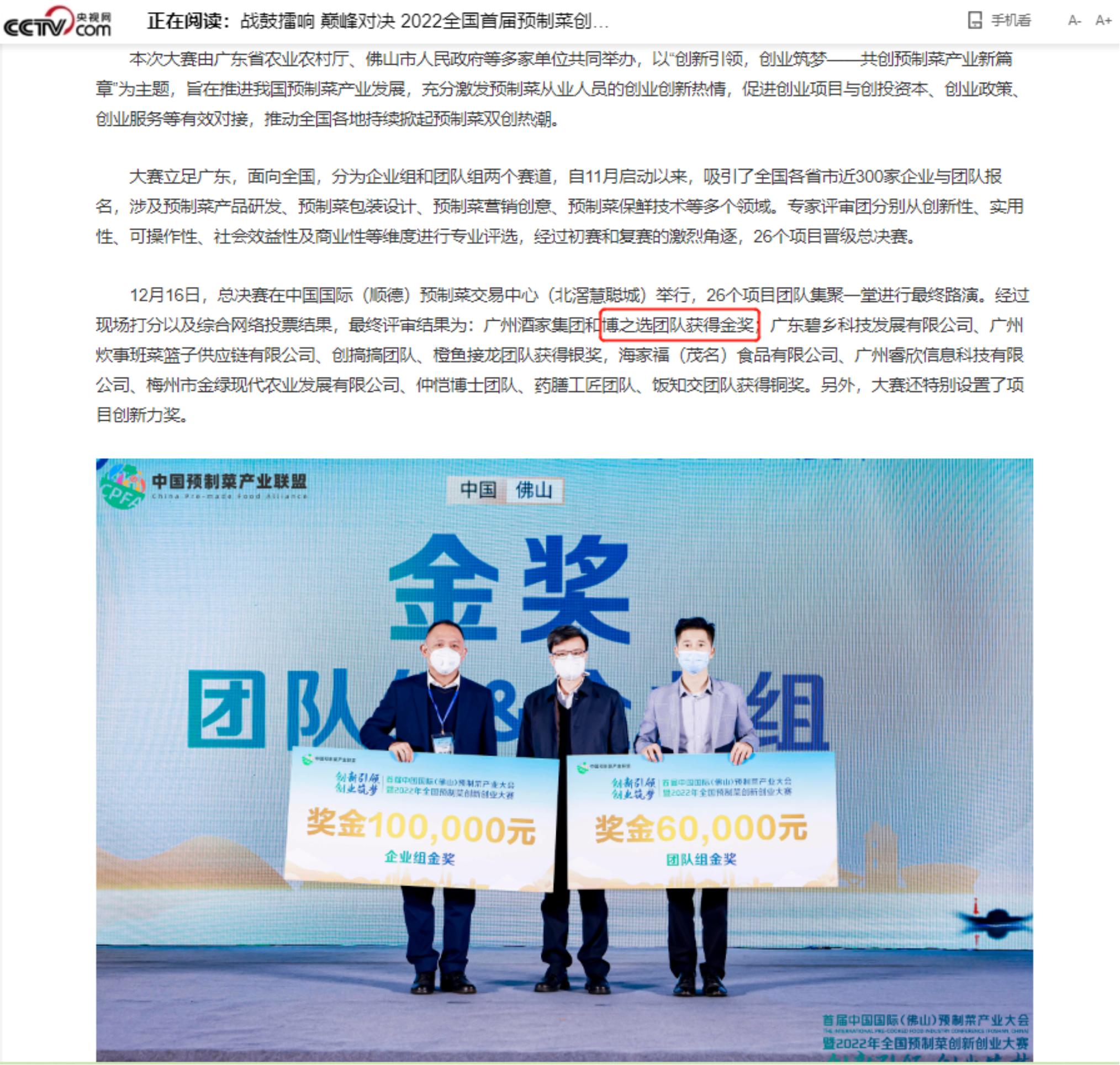 2022年首届全国预制菜创新创业大赛由广东省农业农村厅、佛山市人民政府、中国预制菜产业联盟等多家单位共同举办,以“创新引领,创业筑梦——共创预制菜产业新篇章”为主题,旨在推进我国相关产业发展,充分激发创业创新热情,促进创业项目与创投资本、创业政策、创业服务等有效对接,推动全国各地持续掀起预制菜双创热潮。本次大赛立足广东,面向全国,分为企业组和团队组两个赛道,自11月启动以来,吸引了全国各省市近300家企业与团队报名,涉及预制菜产品研发、预制菜包装设计、预制菜营销创意等多个领域。