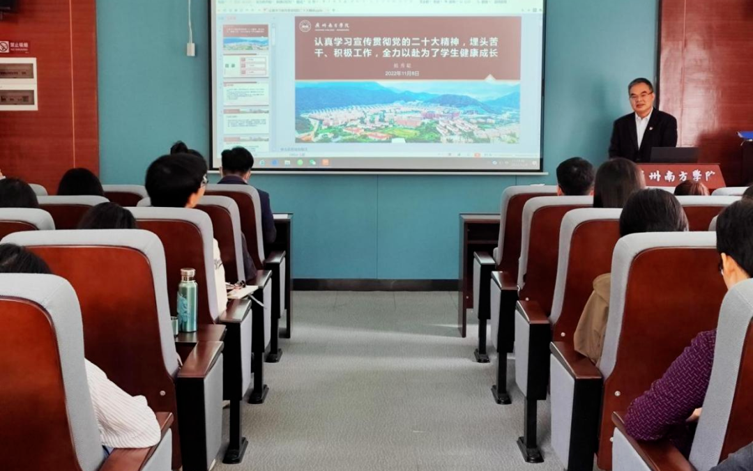 11月22日上午,第一宣讲队队长、学生处处长吴迎新结合学生工作实际,面向全体辅导员开展党的二十大精神宣讲。吴迎新处长立足于学生工作中的难点、痛点和重点,详细剖析其中缘由,引导学工队伍要以党的二十大精神武装头脑,不断提高思想理论水平和政策理解水平,准确把握文件精神实质;充分调动多方力量,如首席学生成长导师、各院系学生成长导师、学生班主任等,将更多的关注、关心和关爱投入到学生工作中;在工作中养成良好的工作习惯,端正工作态度,改进工作方法,积极完善自我,做好学生成长的“引路人”。