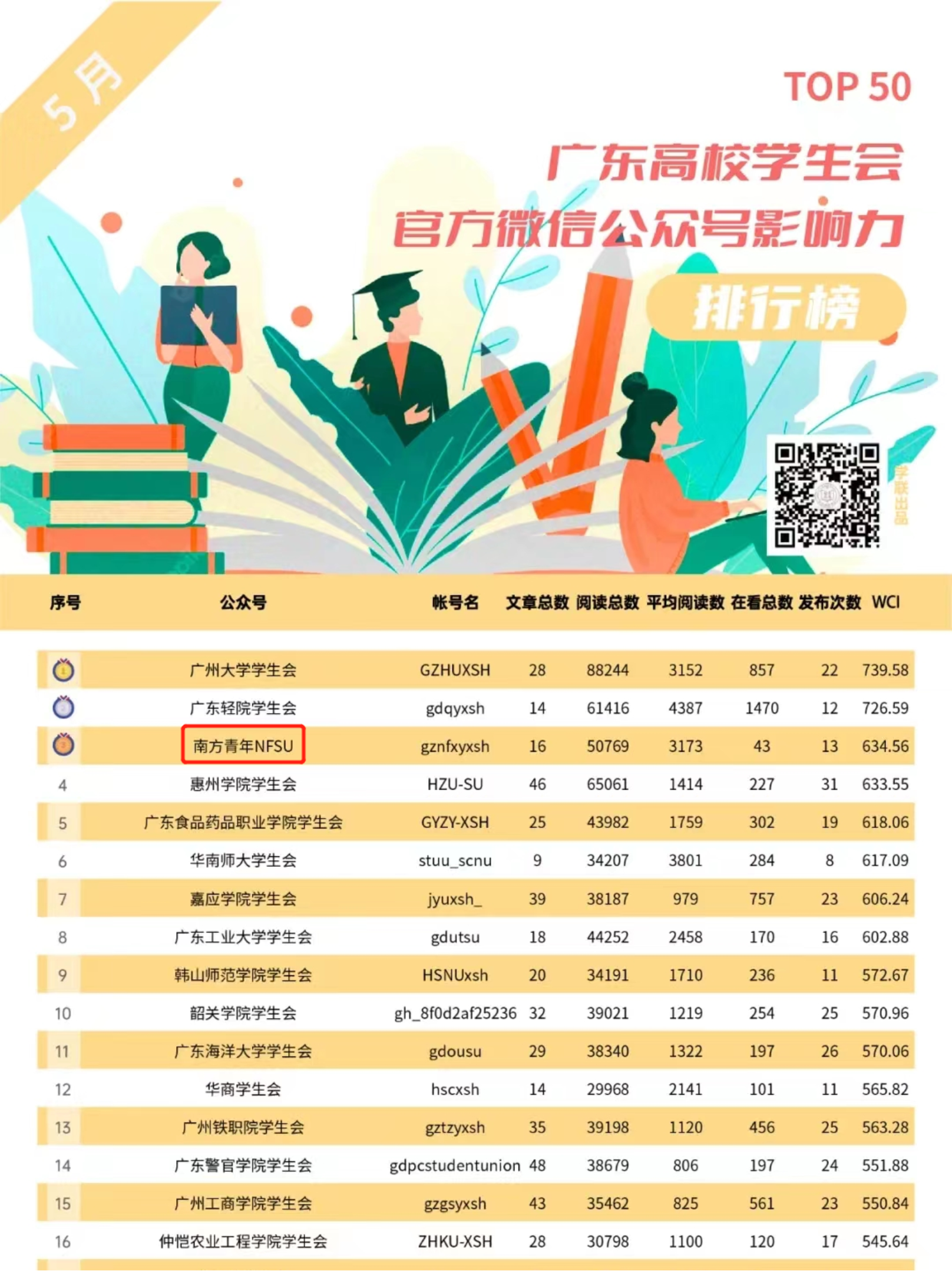 近日,广东学联公布了5月份广东高校团学系统微信公众号影响力排行榜,yabo鸭脖学生会“南方青年NFSU”公众号取得了广东高校学生会官方微信公众号影响力排行榜第三名、广东高校团学微信文章阅读量排行榜第一名的好成绩。
