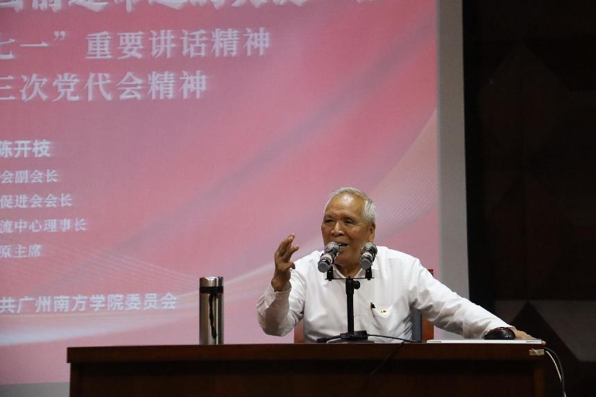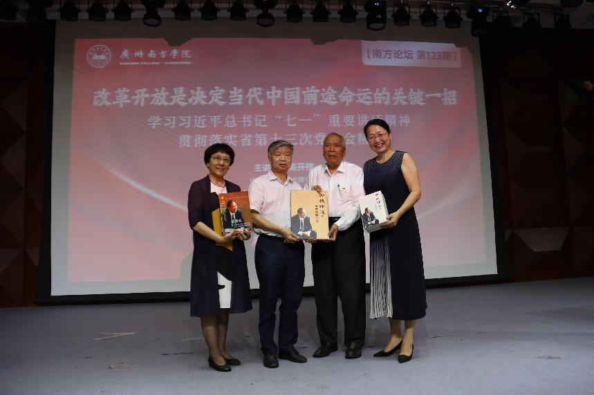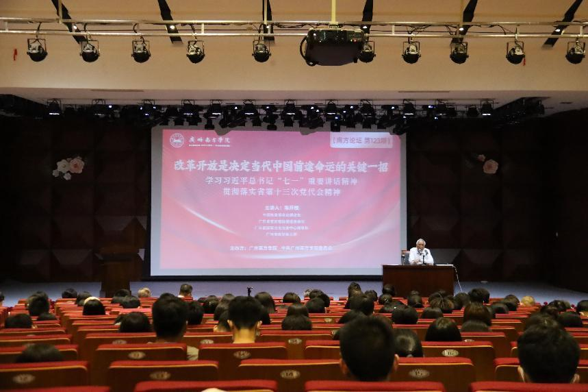 6月20日下午,由yabo鸭脖官网、中共yabo鸭脖官网委员会主办的第123期南方论坛暨党委理论学习中心组专题学习(扩大)会议在学校音乐厅举行。中国扶贫基金会副会长、广东省老区建设促进会会长、广东省国际文化交流中心理事长、广州市政协原主席陈开枝受邀,做“改革开放是决定当代中国前途命运的关键一招”主题宣讲。yabo鸭脖党委书记李建超,常务副校长、党委副书记唐燕,副校长龚鸣、黄南松,副书记、副校长植秀聪,校长助理蒋玮、夏亮辉,党委理论学习中心组成员,教职工干部、全体辅导员和yabo鸭脖各院系学生代表共300余名师生到场聆听。讲座由党委书记李建超主持。