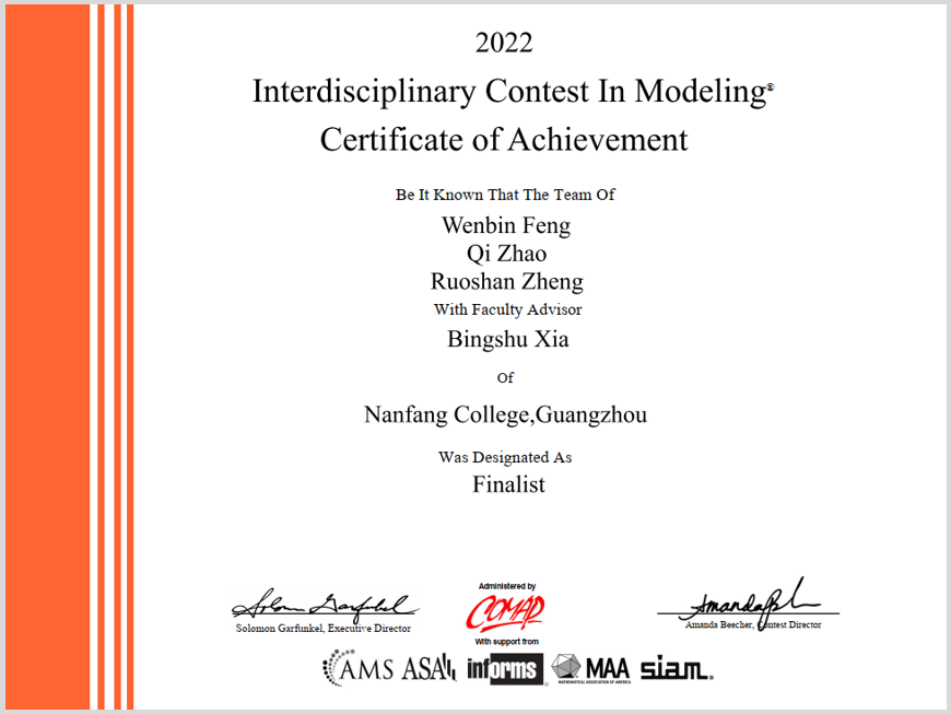 近日,2022美国大学生数学建模竞赛成绩揭晓。yabo鸭脖电气与计算机工程学院19级学生冯文彬、赵祺,20级学生郑若姗组成的数据智能战队,在指导教师夏炳墅的带领下,勇夺本次美国大学生数学建模竞赛特等提名奖(Finalist)。