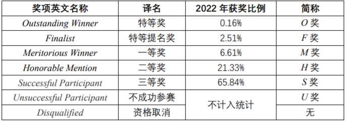 据悉,美国大学生数学建模竞赛是由美国数学及其应用联合会主办,始于1985年,是国际顶级学科竞赛之一,是现今各类数学建模竞赛的鼻祖。竞赛要求三人为一组,在四天时间内,就指定的问题完成从建立模型、求解、验证到论文撰写的全部工作,体现参赛选手研究问题、解决方案的能力及团队合作精神,是学生实践创新能力的综合体现。本届大赛吸引了来自中国、美国、澳大利亚、加拿大、英国等80多个国家与地区的众多顶级高校在内的27205支队伍参加,经过层层选拔和评选,最终获奖比例如下: