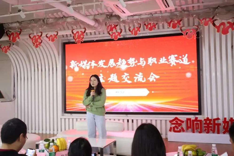 接下来是新媒体发展趋势与职业赛道的主题交流会。人民日报华南报业发展部佛山运营中心主任邵铭先生、网易传媒佛山运营中心陈惠婷女士、知乎副主编陈颖宜女士以及我院胡美香副教授作为嘉宾在台上进行交流。各位老师深入浅出,通过自身工作经验和具体事例阐述前瞻的媒体理念,让大家对新媒体有了更深入的了解,并激励同学们将所学所感的爱国情、强国志、报国行融入到坚持和发展中国特色社会主义事业的奋斗之中。