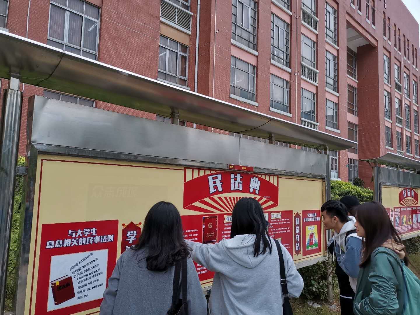 为深入开展普法教育,yabo鸭脖在图书馆两侧长达40米的宣传栏宣传民法典。12月3-4日,学校组织教师、志愿者担任义务讲解员,为驻足学生讲解民法典内容。一些同学在学习民法典后表示,通过观看宣传栏、听取志愿者讲解,更加深入地了解了自己的权利义务,更认识到自己的责任。