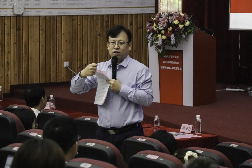 随后,教师代表刘云东作“青年教师的职业理想与规划”主题报告。他结合个人的教学、科研工作经历,给青年教师提了三点建议:一是坚守立德树人的教师职业理想;二是做好人生定位和职业规划;三是做好教学、科研和社会服务之间的工作平衡。