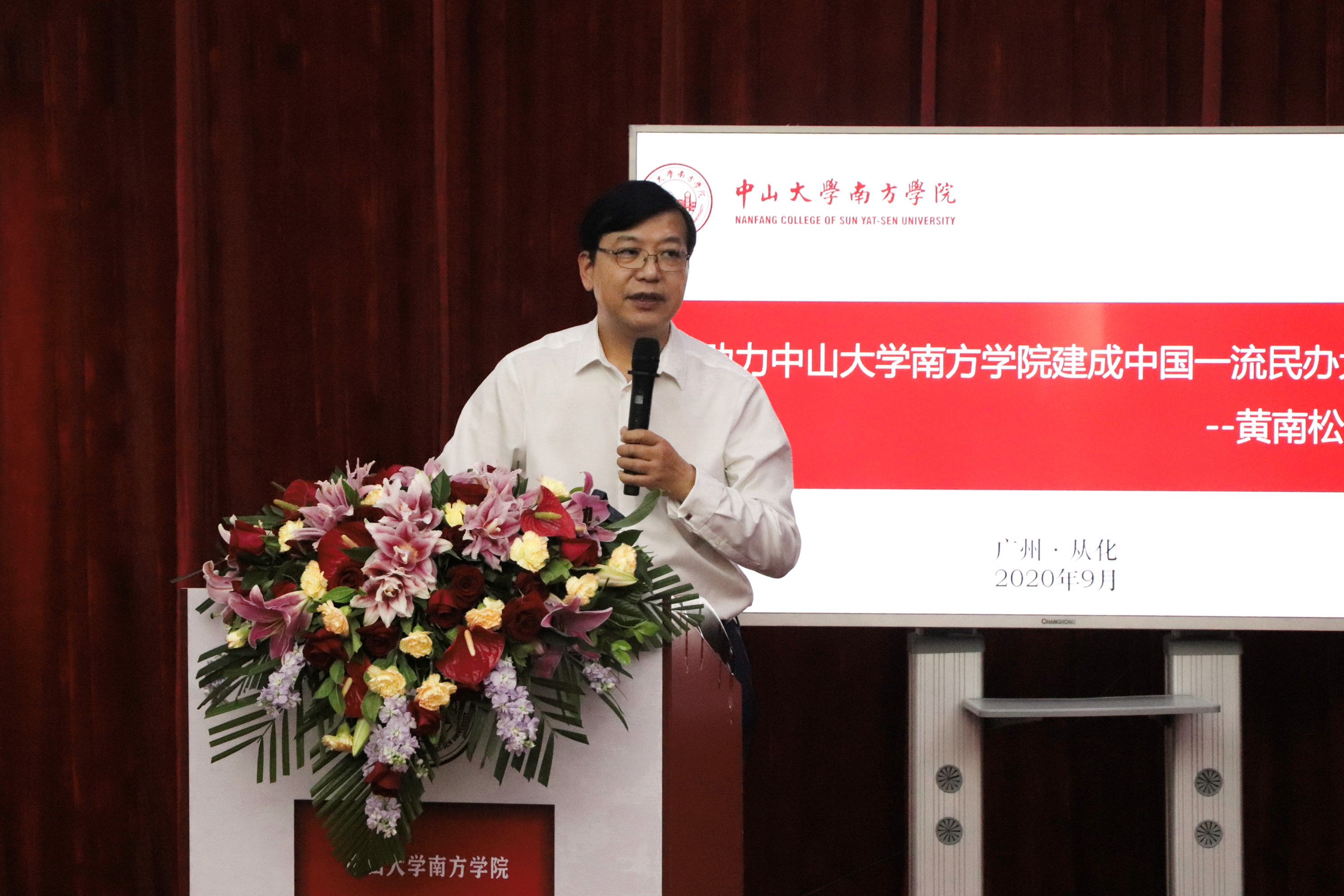 黄南松副校长在会上作了“助力中山大学南方学院建成中国一流民办大学”主题报告。他介绍了学校的基本情况、办学实践和办学成效,谈了学校未来发展以及教师的个人成长。