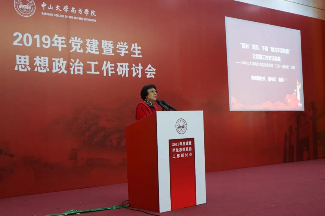 会上,唐燕常务副校长、副书记就学校党建工作特色作了题为《“医治”党员、干部“能力不足危险”之党建工作方法实践——以中山大学南方学院党委坚持“三会一课制度”为例》专题报告。她指出,夯实基层党建工作,应依托“三会一课”平台。基层党支部的建设要时刻防范精神懈怠、能力不足、脱离群众、消极腐败等危险,我们党员干部应从实践中看到这些危险,从危险中去反思、去防范,真正把主题教育的总要求“守初心、担使命,找差距、抓落实”内化于心,外化于行。同时,要建立不忘初心、牢记使命制度,强化制度意识,认真查找制度机制缺项和弊端,将经验做法及时提炼为制度,形成长效机制,将制度优势转化为制度效能。要通过主题教育全面提升党员干部的思想境界,确保主题教育“收官不收场”,始终作为党的建设的永恒课题和全体党员干部的终身课题。
