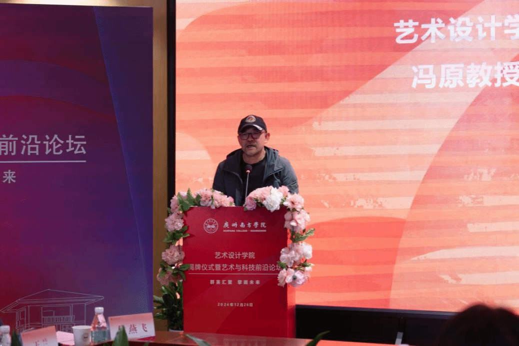 随后,艺术设计学院院长冯原教授发言,他首先向莅临此次活动的领导、嘉宾表示诚挚的欢迎与衷心的感谢。冯原院长回顾了艺术设计与创意产业系的发展历程,他表示,从最初仅有10余名教师的学系发展至今,学科专业设置完善,师资力量显著加强,学生规模稳步增长,整体实力和核心竞争力得到全面提升。他强调,学校成立艺术设计学院是学校强化办学特色、提升办学质量做出的决策部署,为进一步推动艺术设计等学科转型升级提供了新的发展机遇。他表示,学院将紧贴社会和市场需求,强化学科特色建设,创新学生培养模式,凝聚师资团队力量,推进艺术设计专业人才培养的高质量发展,向社会输送兼具家国情怀、国际视野的高素质艺术类应用型人才。