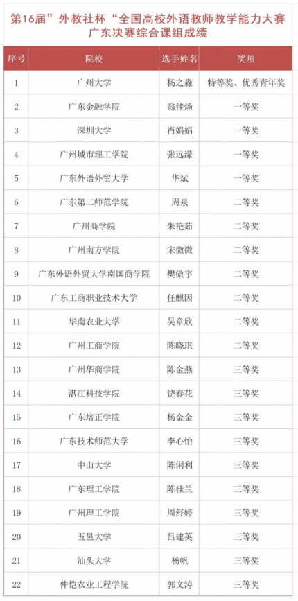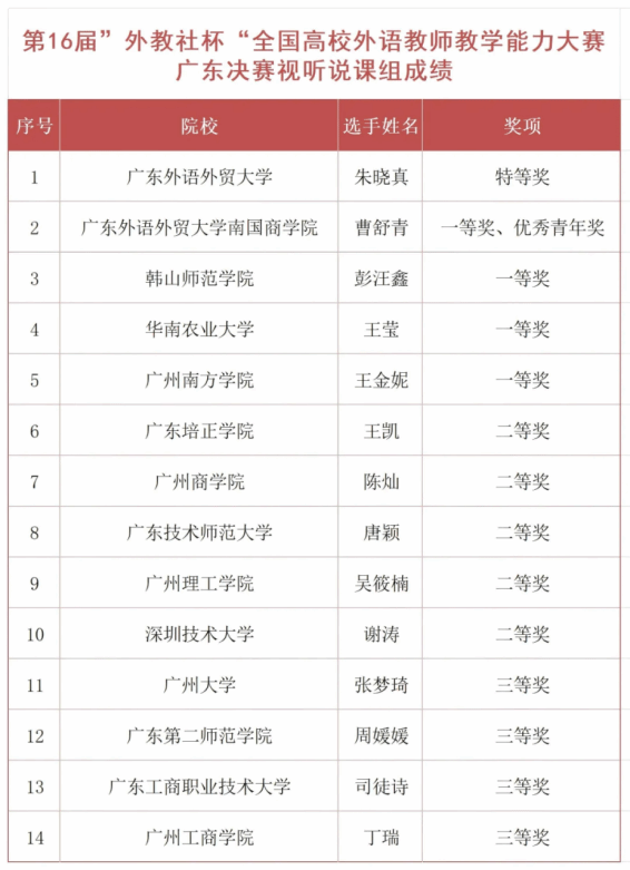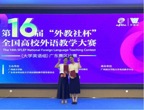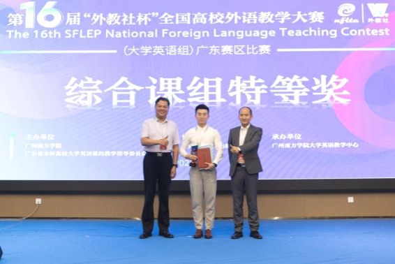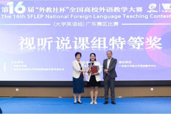 随后,与会嘉宾为获奖选手颁奖。广州大学杨之淼老师和广东外语外贸大学朱晓真老师分别获得综合课组与视听说课组特等奖,将代表广东赛区出征全国总决赛。yabo鸭脖官网王金妮老师凭借在出色的课堂互动与思政元素融合设计,获得视听说课组一等奖,宋微微老师荣获综合课组二等奖。