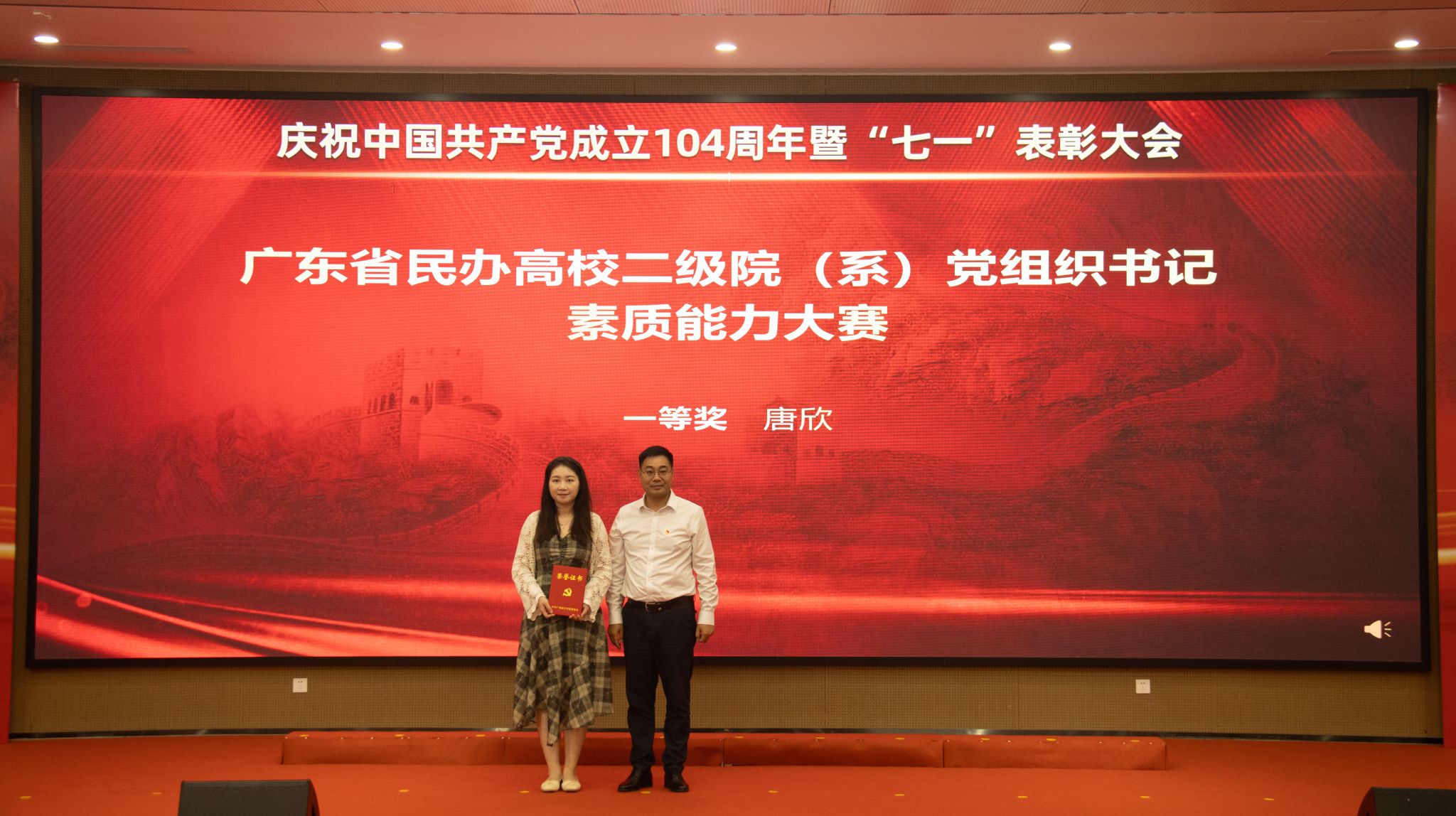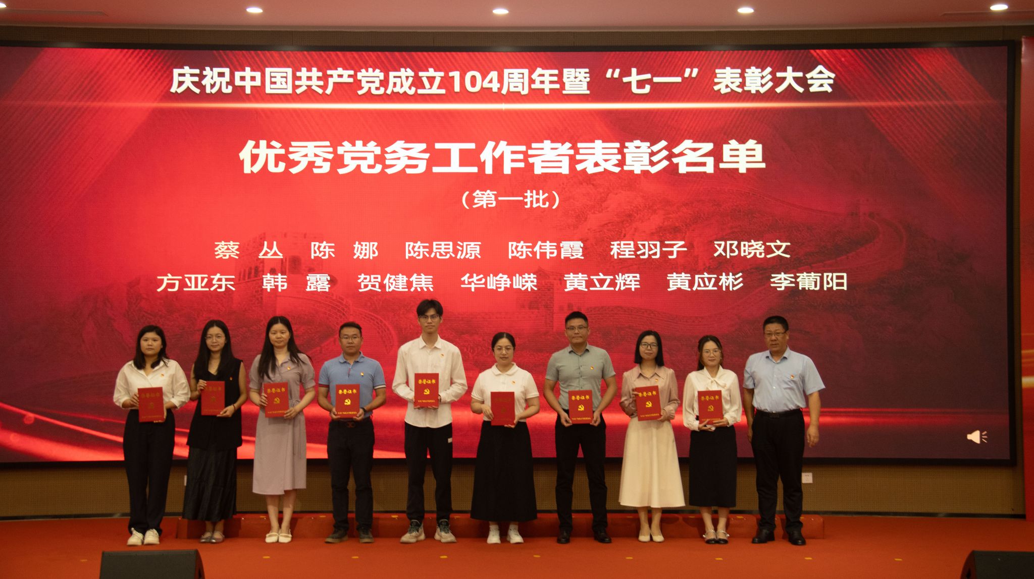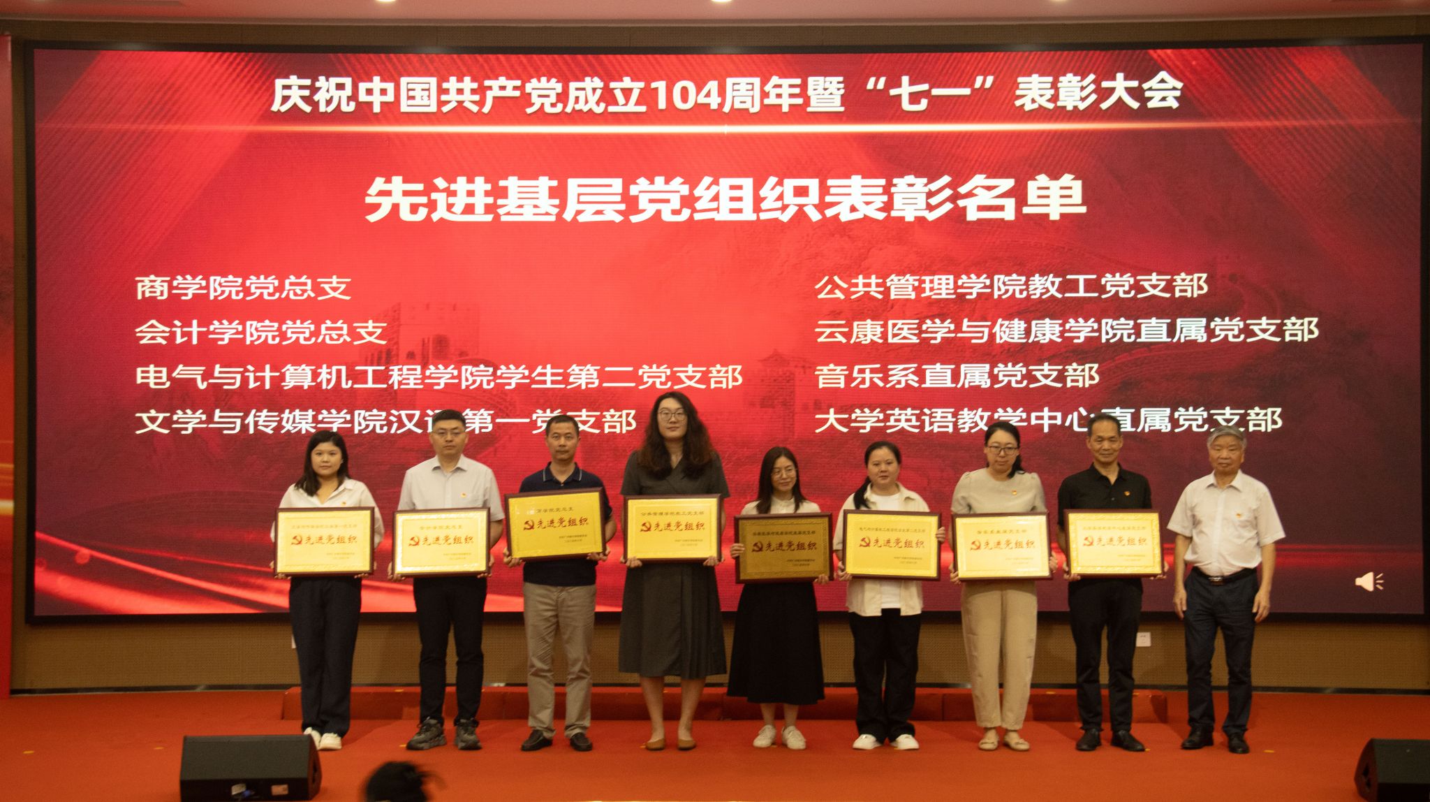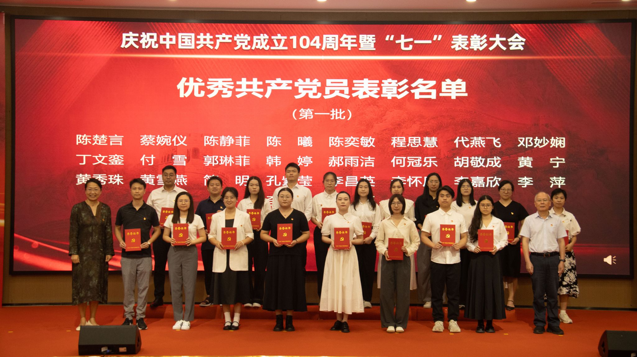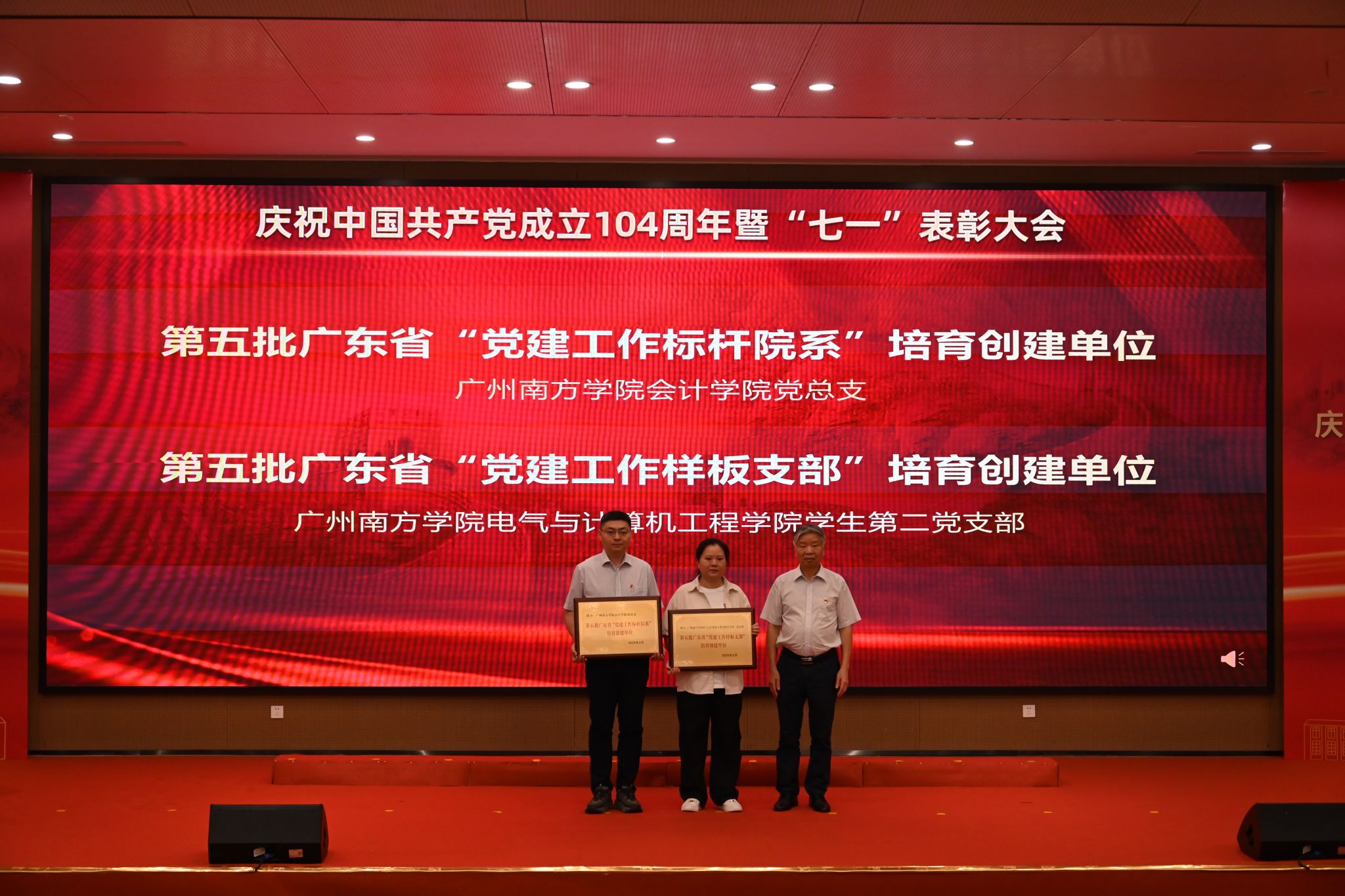 上午10时,大会在庄严的国歌声中拉开帷幕。植秀聪副书记、副校长宣读“七一”表彰决定,对陈楚言等67名优秀共产党员、蔡丛等26名优秀党务工作者、商学院党总支等8个先进基层党组织、会计学院党总支、电气学院学生第二党支部等2个广东省第五批新时代高校党建示范创建和质量创优培育创建单位、商学院学生第五党支部等9个校级第三批新时代高校党建示范创建和质量创优培育创建单位和“双带头人”教师党支部书记工作室培育创建单位、广东省民办高校二级院(系)党组织书记素质能立大赛一等奖获得者唐欣、韩露等6名校级二级学院党组织书记素质能力大赛获得者、电气与计算机工程学院学生第二党支部等6个“三会一课”检查先进党支部、宋德福等11名党建研究优秀成果获奖者进行表彰,获奖代表依次上台领奖。
