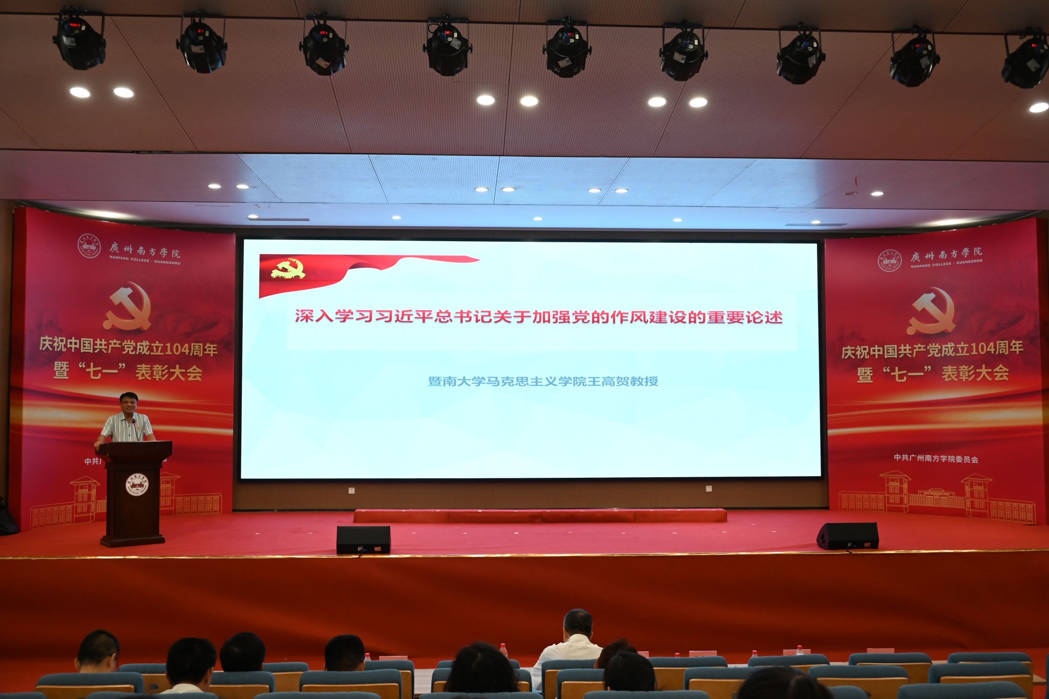 表彰大会结束之后,暨南大学马克思主义学院王高贺教授作深入贯彻中央八项规定精神学习教育专题辅导报告。报告论述了加强党的作风建设的重大意义、本质属性和核心要义。