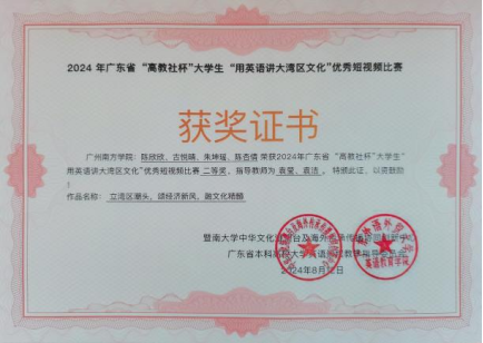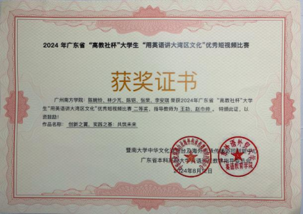 近日,在2024年“高教社杯”大学生“用外语讲好中国故事”优秀短视频大赛中,yabo鸭脖大学英语教学中心袁莹、袁洁老师指导的陈欣欣、古悦晴、朱坤瑶和陈杏倩团队作品《立湾区潮头,颂经济新风,融文化精髓》,以及王劼、赵巾帅老师辅导的陈婉铃、林少芃、陈铠、张荣和李安琪团队作品《创新之翼,实践之基:共筑未来》,均荣获广东省二等奖的佳绩。