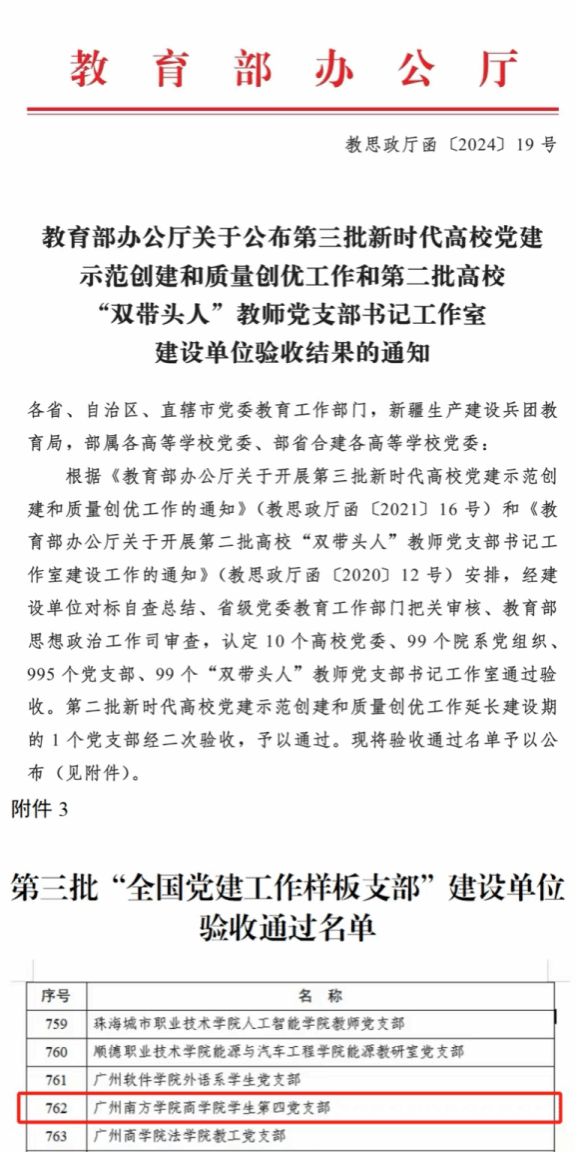 近日,教育部思想政治工作司公布第三批新时代高校党建示范创建和质量创优工作和第二批高校“双带头人”教师党支部书记工作室建设单位验收结果。yabo鸭脖商学院学生第四党支部作为第三批“全国党建工作样板支部”建设单位,通过开展一系列创新举措和实践活动,实现了预期目标,取得了显著成效,顺利通过教育部的验收。