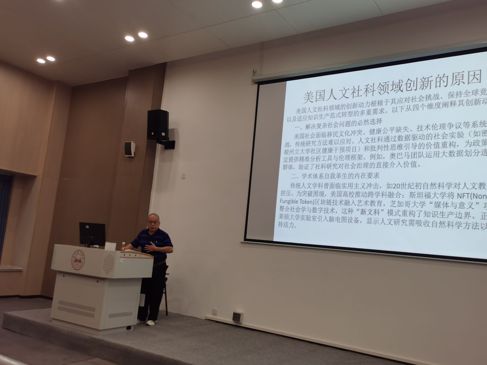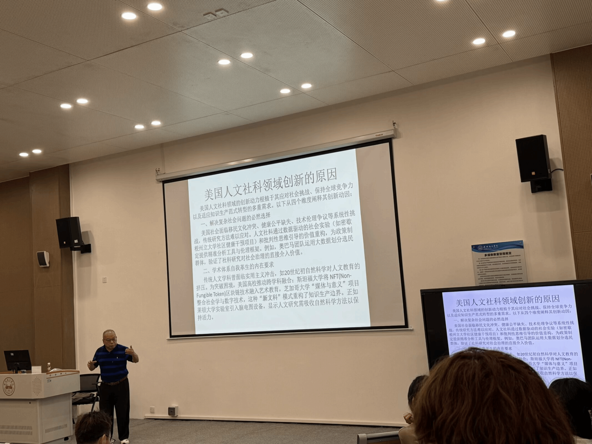 讲座伊始,许光秋教授指出,美国人文社科领域的创新动力源自应对社会挑战及知识生产范式转型等多重需求。通过密歇根州立大学的社区健康干预项目等案例,他强调人文社科在解决复杂社会问题中的实践价值。同时,他以斯坦福大学将区块链技术融入艺术教育为例,阐释跨学科融合的“新文科”模式对学术体系革新的重要意义。