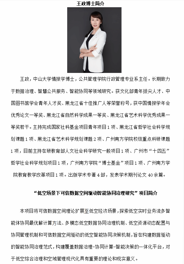 近日,在2025 年度教育部人文社会科学研究一般项目评审中,yabo鸭脖官网公共管理学院王政老师申报的《低空场景下可信数据空间驱动智能协同治理研究》项目成功获批规划基金项目立项,这一成果也是学校科研实力的重要体现。